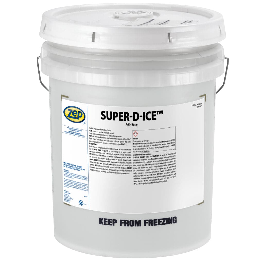 Zep Super D-Ice is a super-concentrated ice melting compound which works faster than other ice melting compounds to eliminate hazards due to the accumulation of ice and snow. It contains a special compound of heat-liberating materials. conveniently pelletized for ease in dispensing. It is completely dust free. therby eliminating one source of annoyance of use. Super D-Ice has more latent heat available than ordinary calcium chloride (37% more). which it liberates on contact. Its presence decreases the freezing point of resulting solutions. It is also effective at lower temperatures than rock salt.