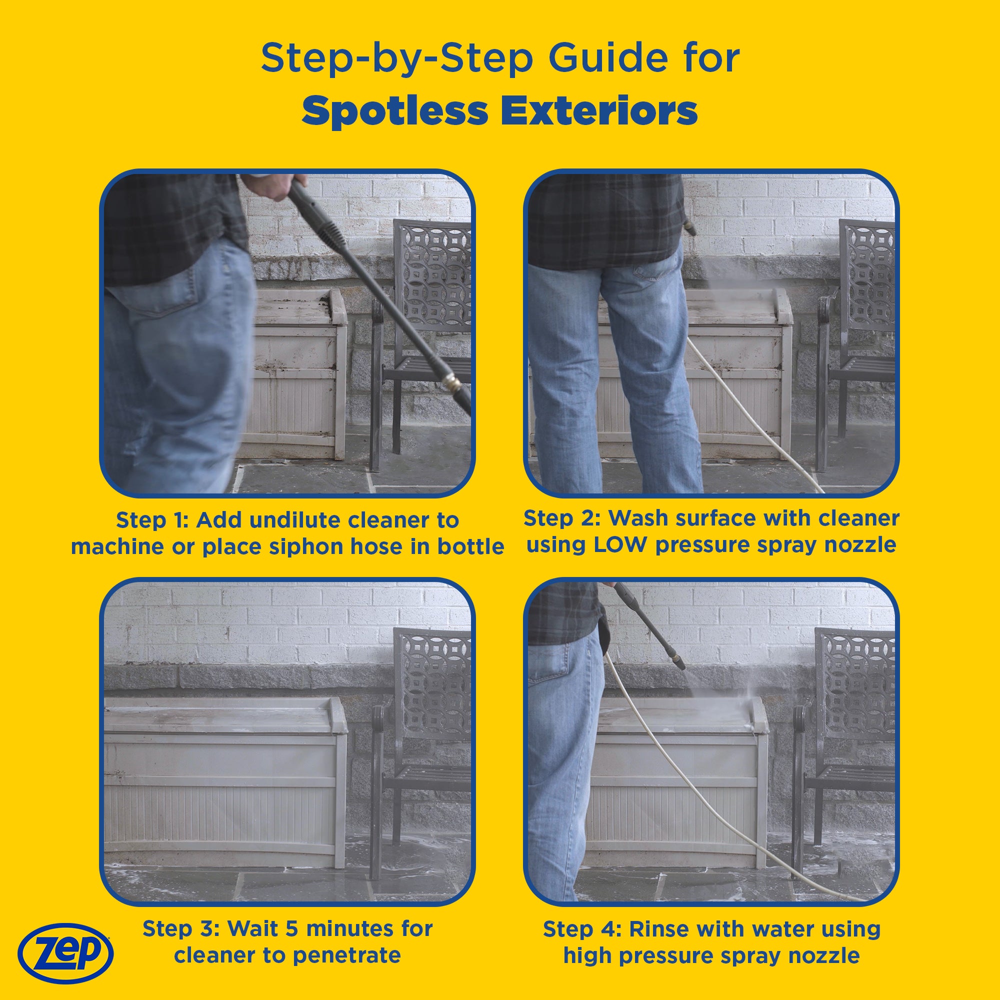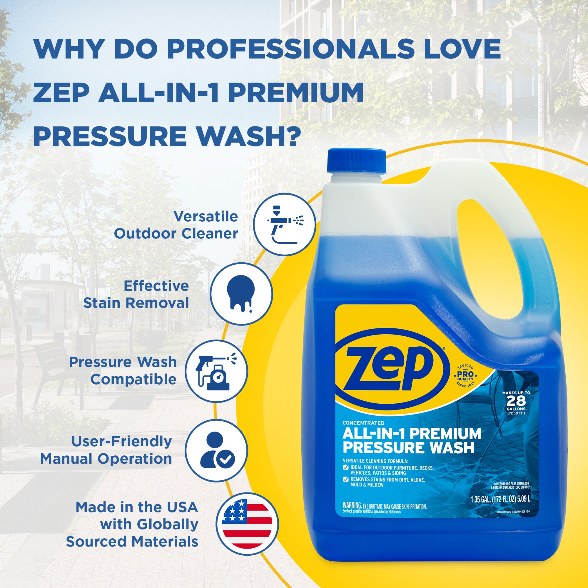 Zep All-in-1 Pressure Wash Cleaner is a powerful. concentrated pressure washer cleaning agent designed to tackle tough outdoor cleaning tasks. Great for outdoor furniture. decks. vehicles. patios. and siding. this versatile cleaner removes dirt. algae stains. mold and mildew stains. Its easy-to-use formula ensures a thorough clean with just a spray and rinse. making it ideal for maintaining the appearance of various outdoor surfaces.