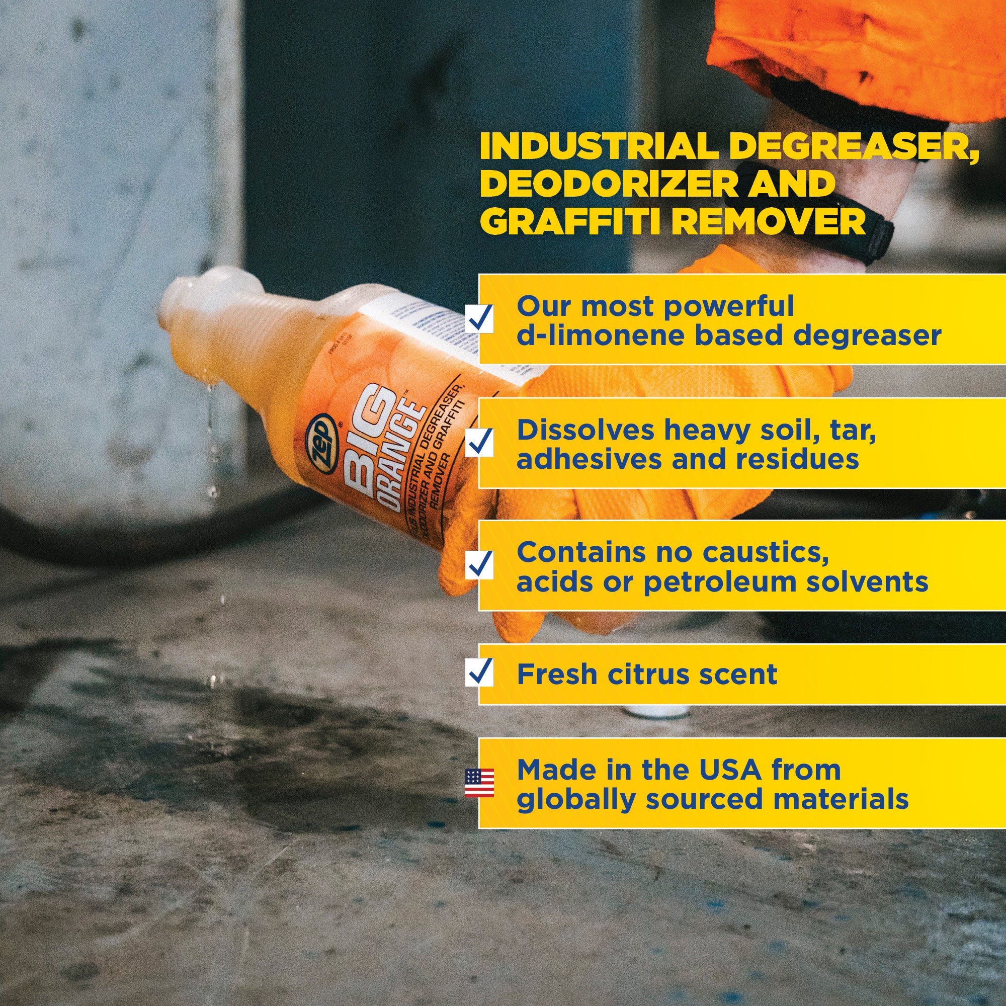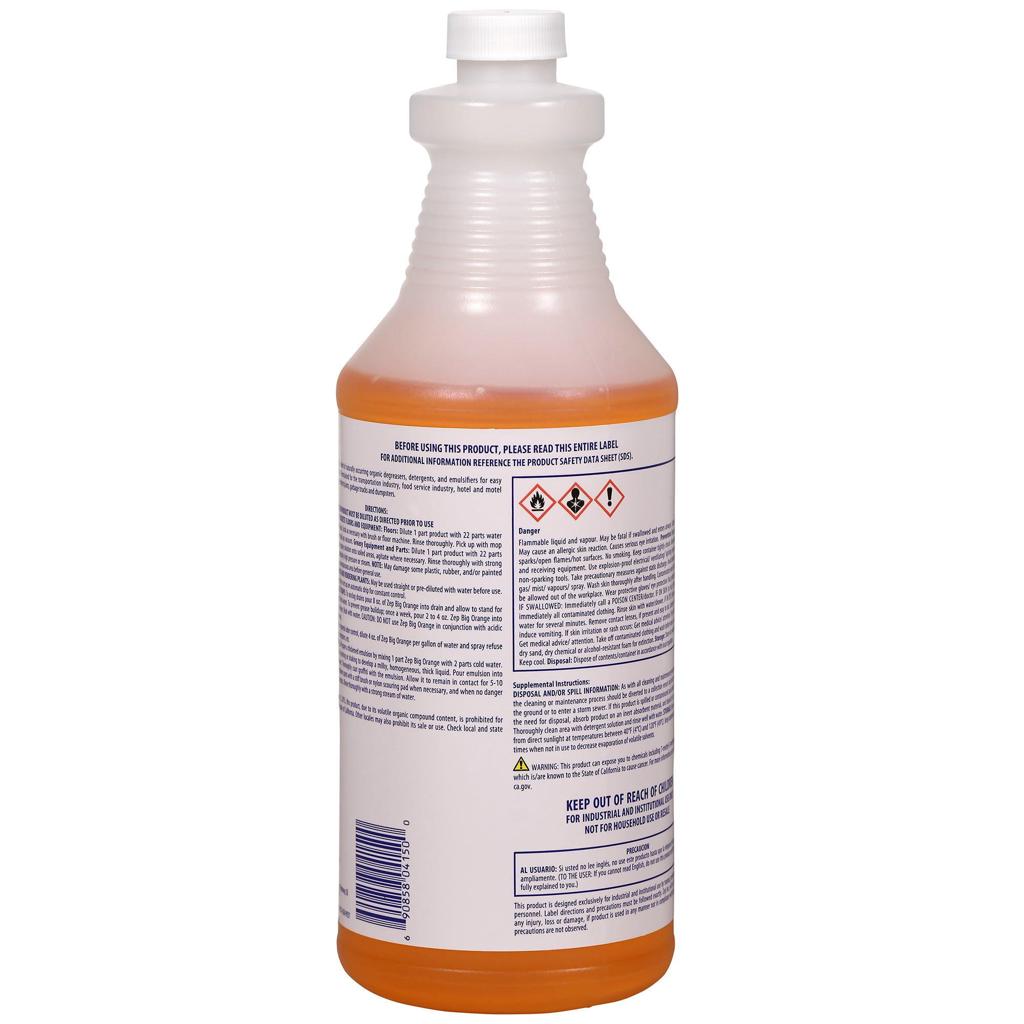 Zep Big Orange is a professional-grade. citrus cleaner. degreaser. and deodorizer for industrial and commercial applications. Removes grease. grime. adhesives. and graffiti while also neutralizing tough odors. Use on concrete. equipment. drainpipes. grease traps. and trash cans. Formulated for the transportation industry. food service industry. hotel and motel industry. sewage treatment plants. garbage trucks and dumpsters. Leaves behind a fresh citrus fragrance.