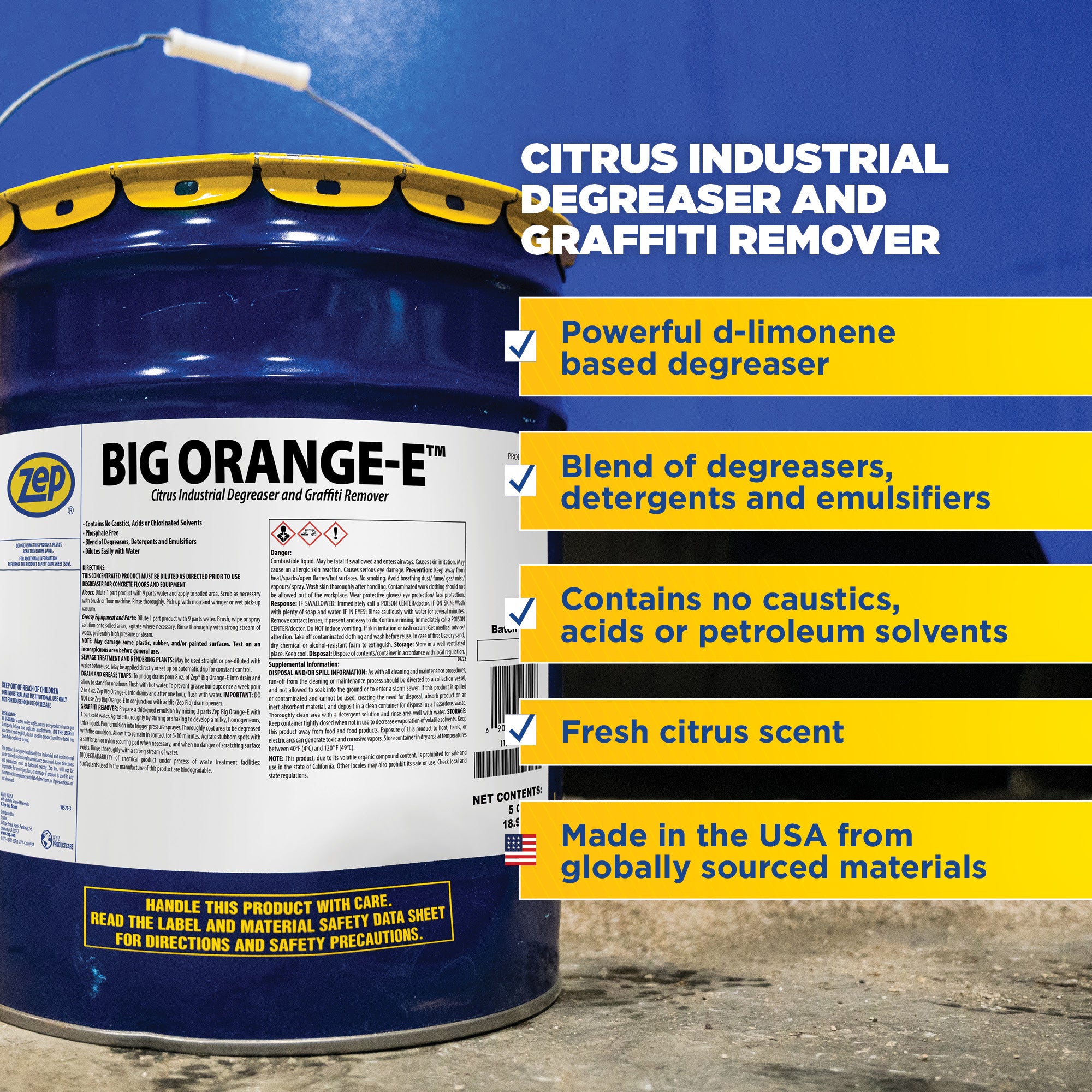 Zep Big Orange-E is a highly effective citrus industrial degreaser and graffiti remover for industrial cleaning applications. It removes grease. tar. adhesives. and other tough residues. Ideal for unpainted concrete. machinery. and graffiti removal. it provides a reliable solution for versatile cleaning needs. Zep Big Orange-E dilutes easily with water and leaves behind a fresh citrus fragrance.