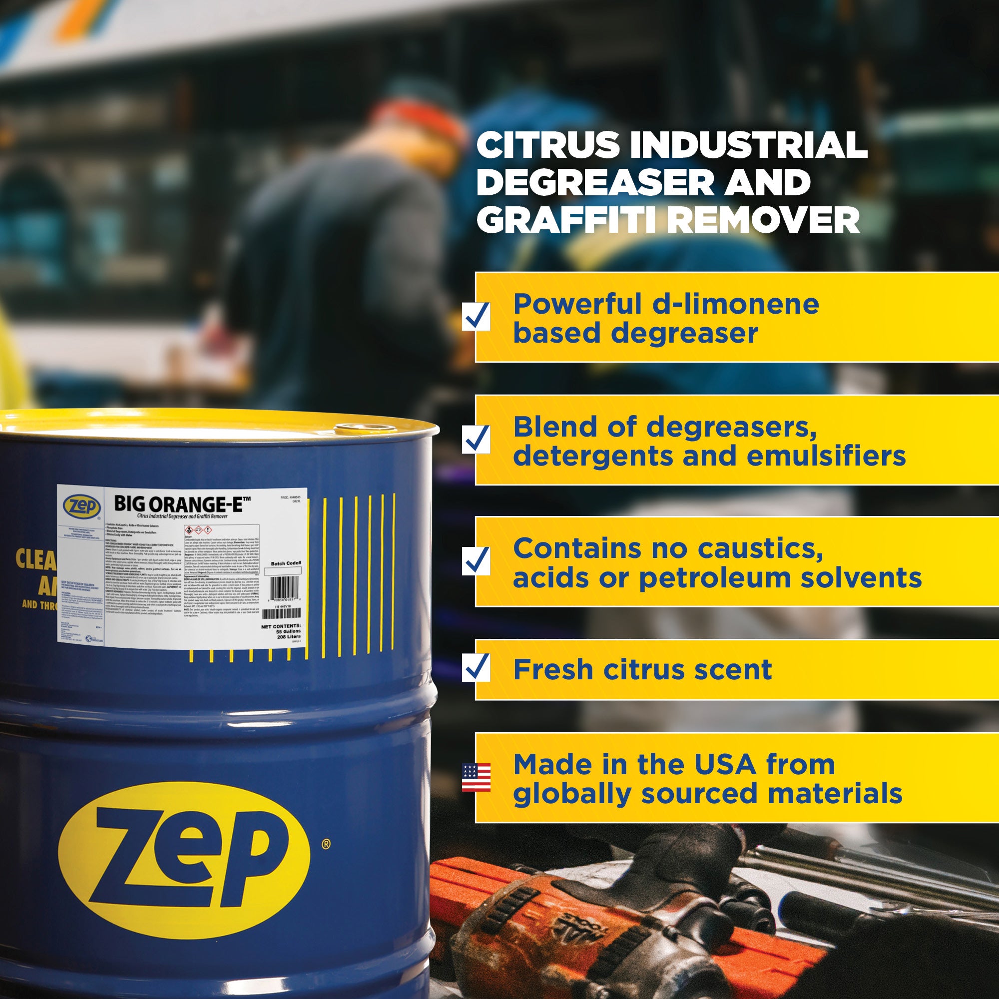 Zep Big Orange-E is a highly effective citrus industrial degreaser and graffiti remover for industrial cleaning applications. It removes grease. tar. adhesives. and other tough residues. Ideal for unpainted concrete. machinery. and graffiti removal. it provides a reliable solution for versatile cleaning needs. Zep Big Orange-E dilutes easily with water and leaves behind a fresh citrus fragrance.