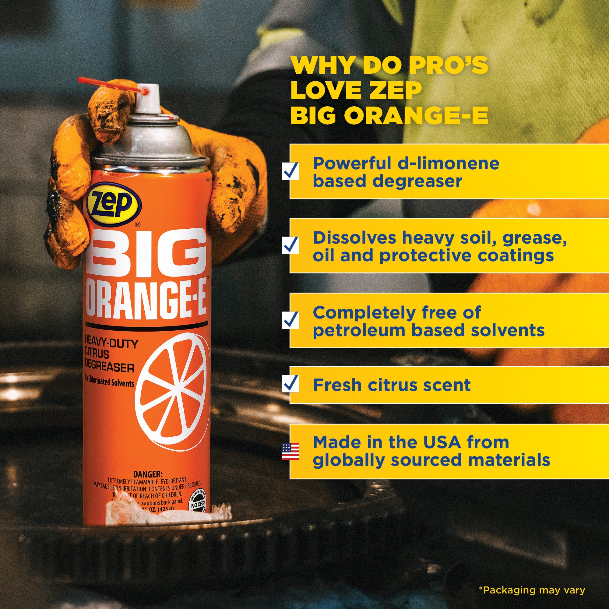 Zep Big Orange-E is a powerful industrial degreaser that tackles heavy grease. oil. and grime with ease. Formulated without chlorinated solvents. this Zep heavy-duty citrus degreaser uses organic degreasing agents for a safer yet effective clean. Perfect for construction tools. machinery. industrial equipment. and concrete surfaces. it dissolves tough buildup while leaving behind a fresh citrus scent.