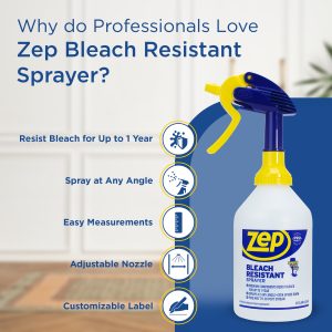 Zep Bleach Resistant Sprayers are a durable. high output spray bottle built with premium bleach-resistant components. Perfect for professionals who work with harsh chemicals. this reliable sprayer lasts up to one year. even with frequent use. This reusable bottle can also be sprayed at any angle and is a sustainable option compared to one time use bottles.