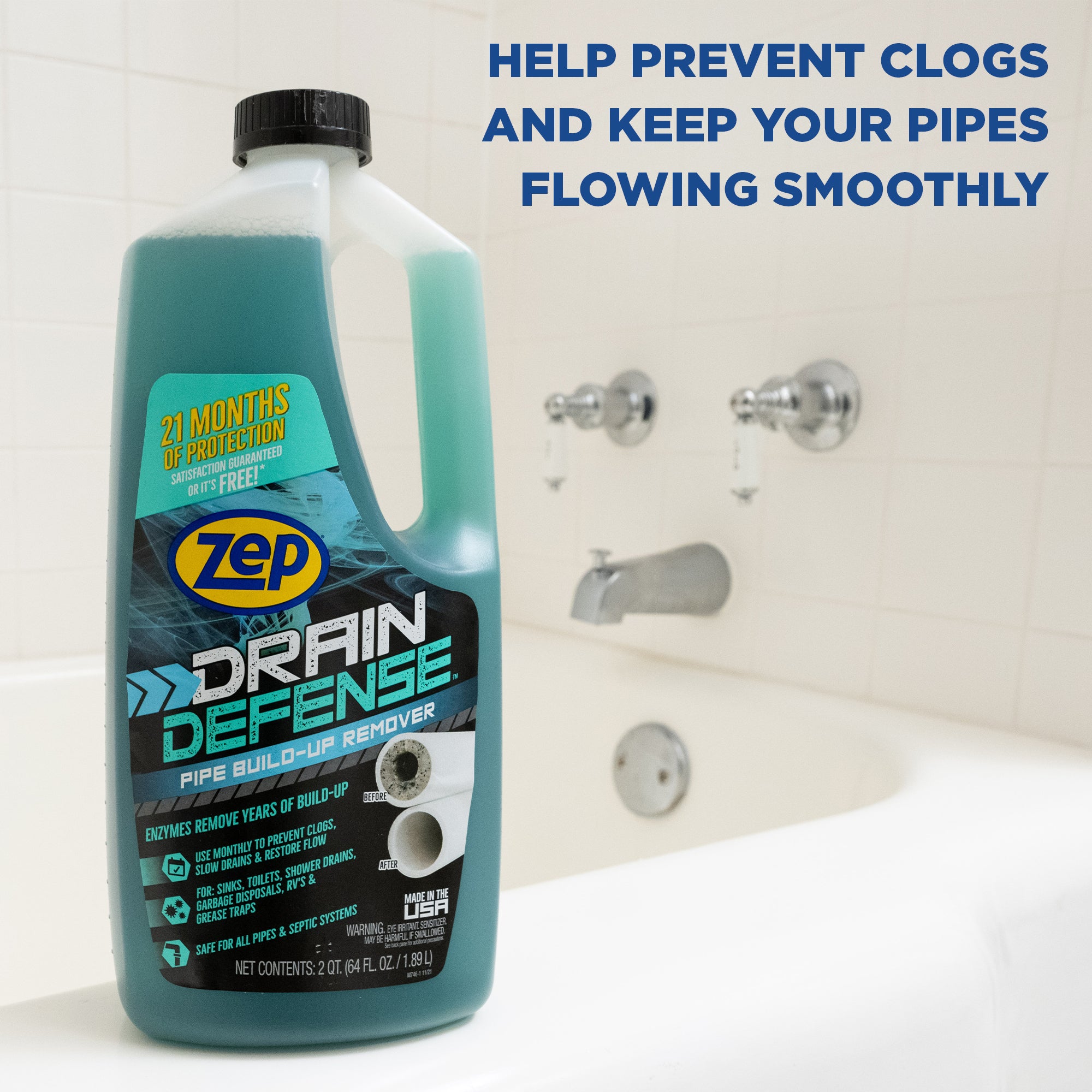Zep Drain Defense is an enzyme and bacteria-based solution designed to tackle years of drain-clogging buildup. helping to prevent future clogs in sinks. toilets. and showers. This septic-safe drain cleaner breaks down buildup into water. minerals. and CO₂. providing an eco-friendly way to maintain your pipes. With each 64-ounce bottle. you get up to 21 months of use.