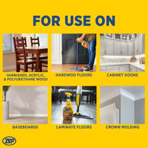 Zep Hardwood & Laminate Floor Cleaner’s ready-to-use formula is designed to clean and restore shine on varnish. acrylic and polyurethane-finished wood and laminate floors. baseboards. cabinet doors. and crown molding. It is fast-drying and works with most refillable spray mops. making it great for regular floor cleaning. Zep Hardwood & Laminate Floor Cleaner has a fresh scent. does not require rinsing. and delivers efficient hardwood and laminate floor cleaning without leaving behind streaks.