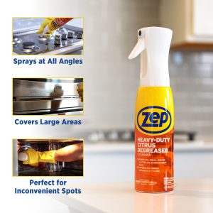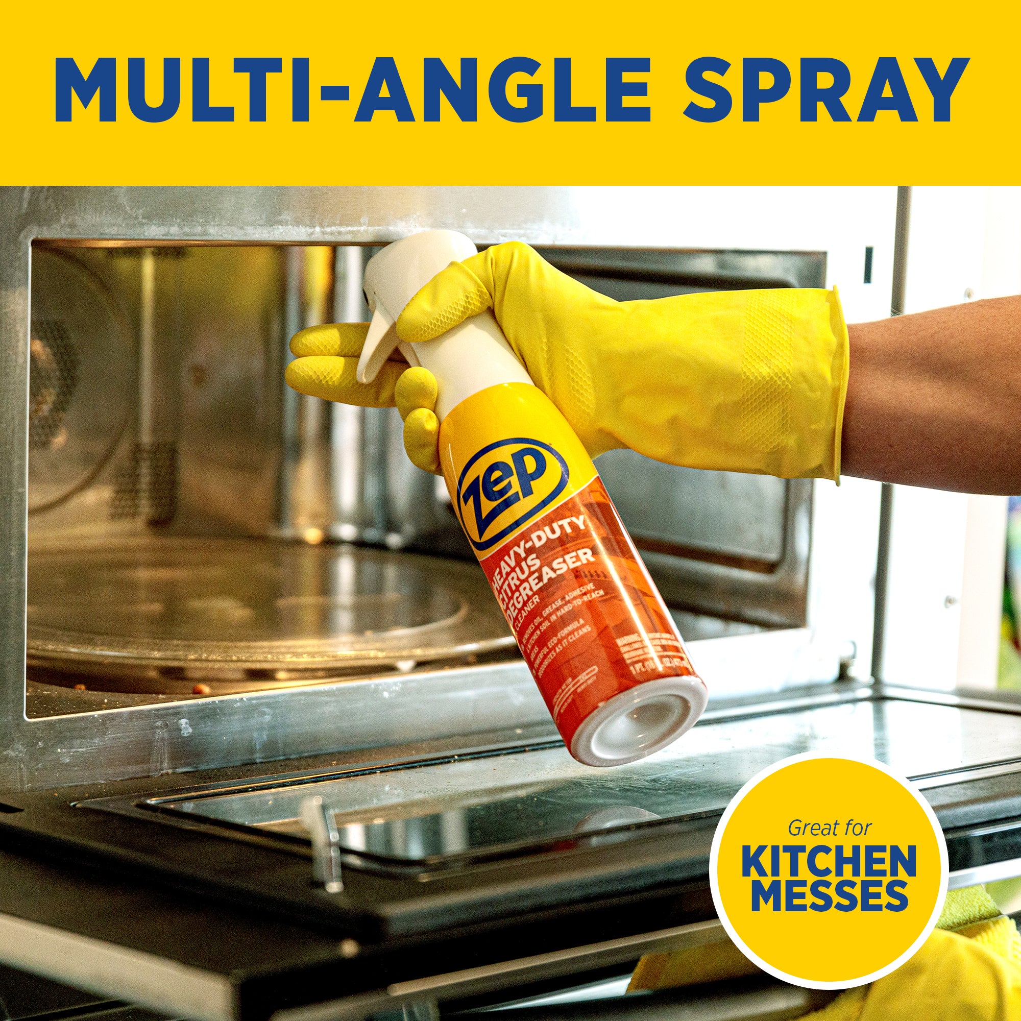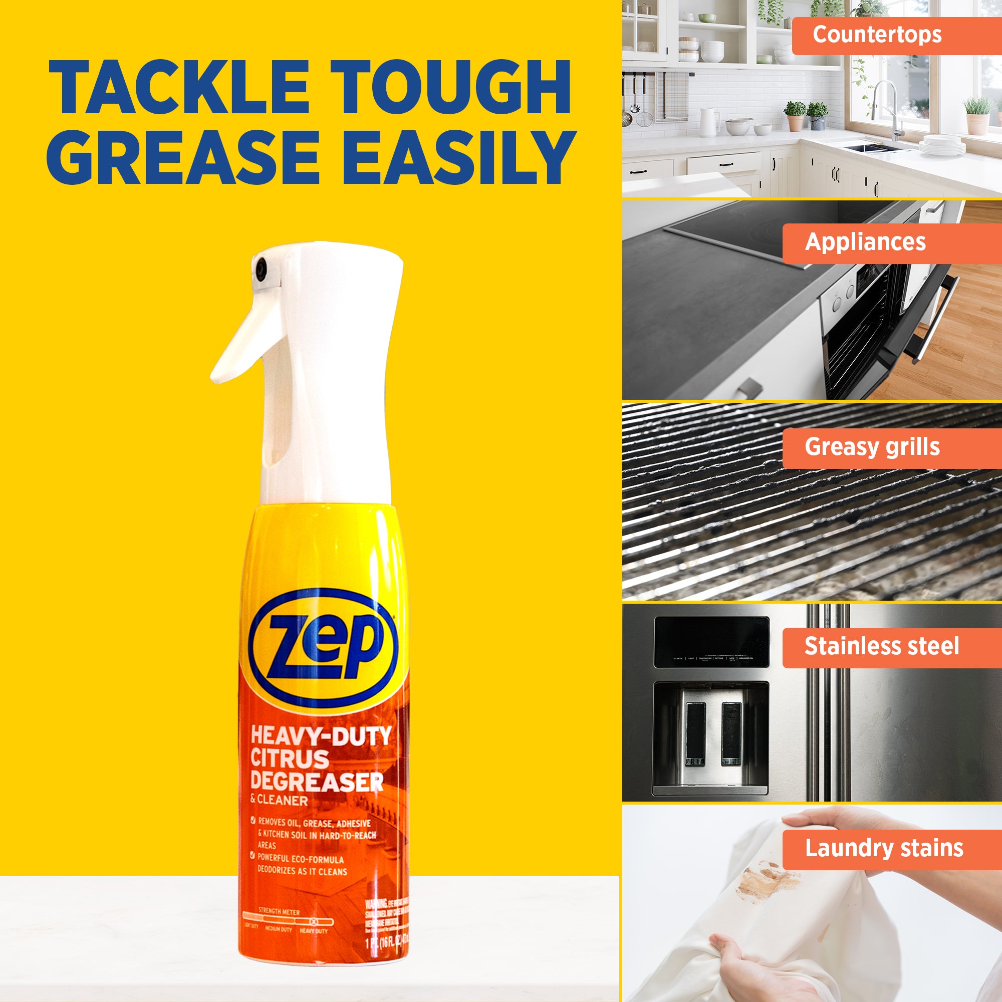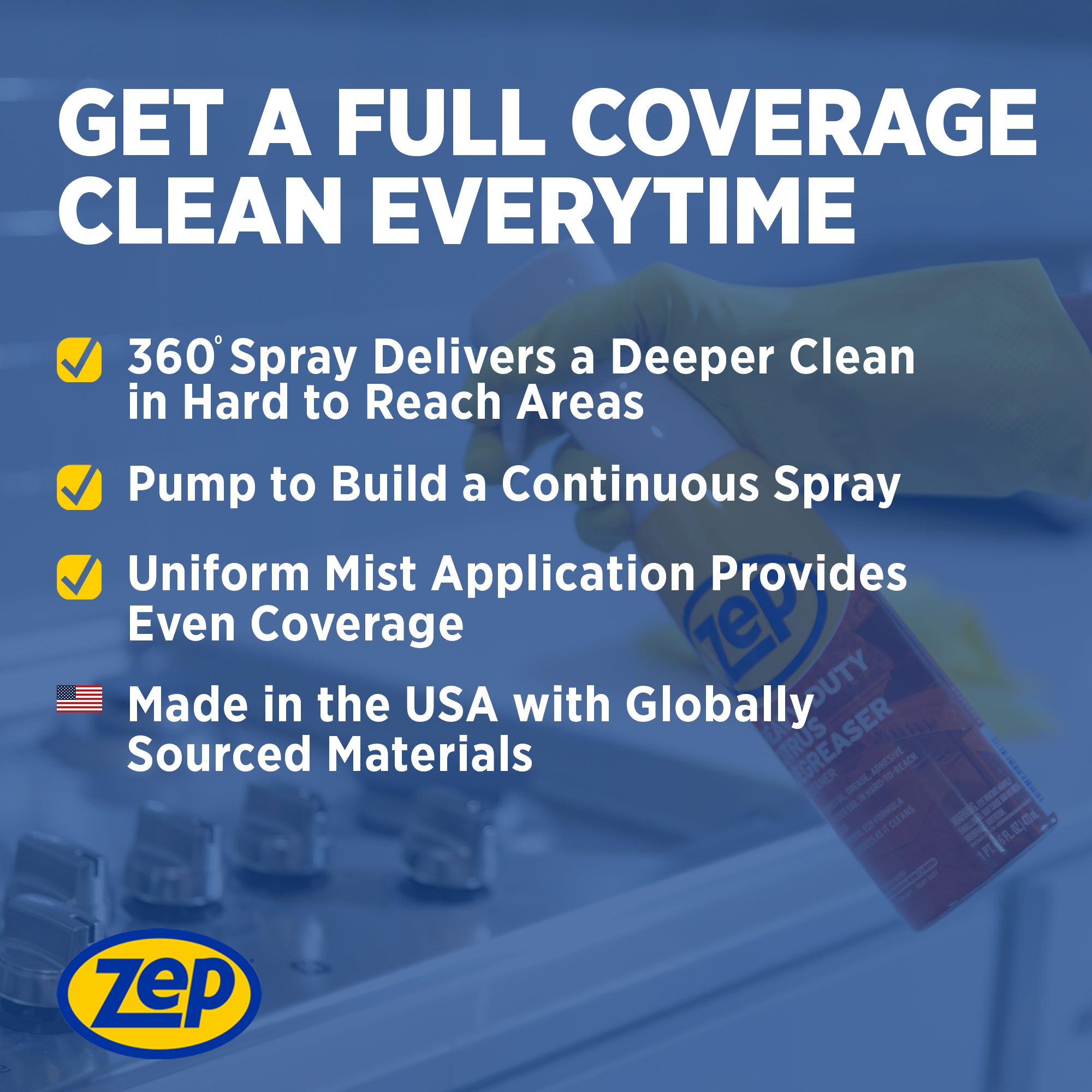 Zep Heavy-Duty Citrus Degreaser & Cleaner removes oil. grease. adhesive. and kitchen soil in hard-to-reach areas. Featuring an aerosol-like spray format. it delivers heavy-duty cleaning with a uniform mist for less waste and extended reach. Its multi-angle spray ensures thorough coverage. making it ideal for grills. engines. stovetops. tools. and kitchen surfaces. Safe for use on metal. fiberglass. stainless steel. and aluminum. this industrial-strength formula is perfect for both commercial and residential applications.