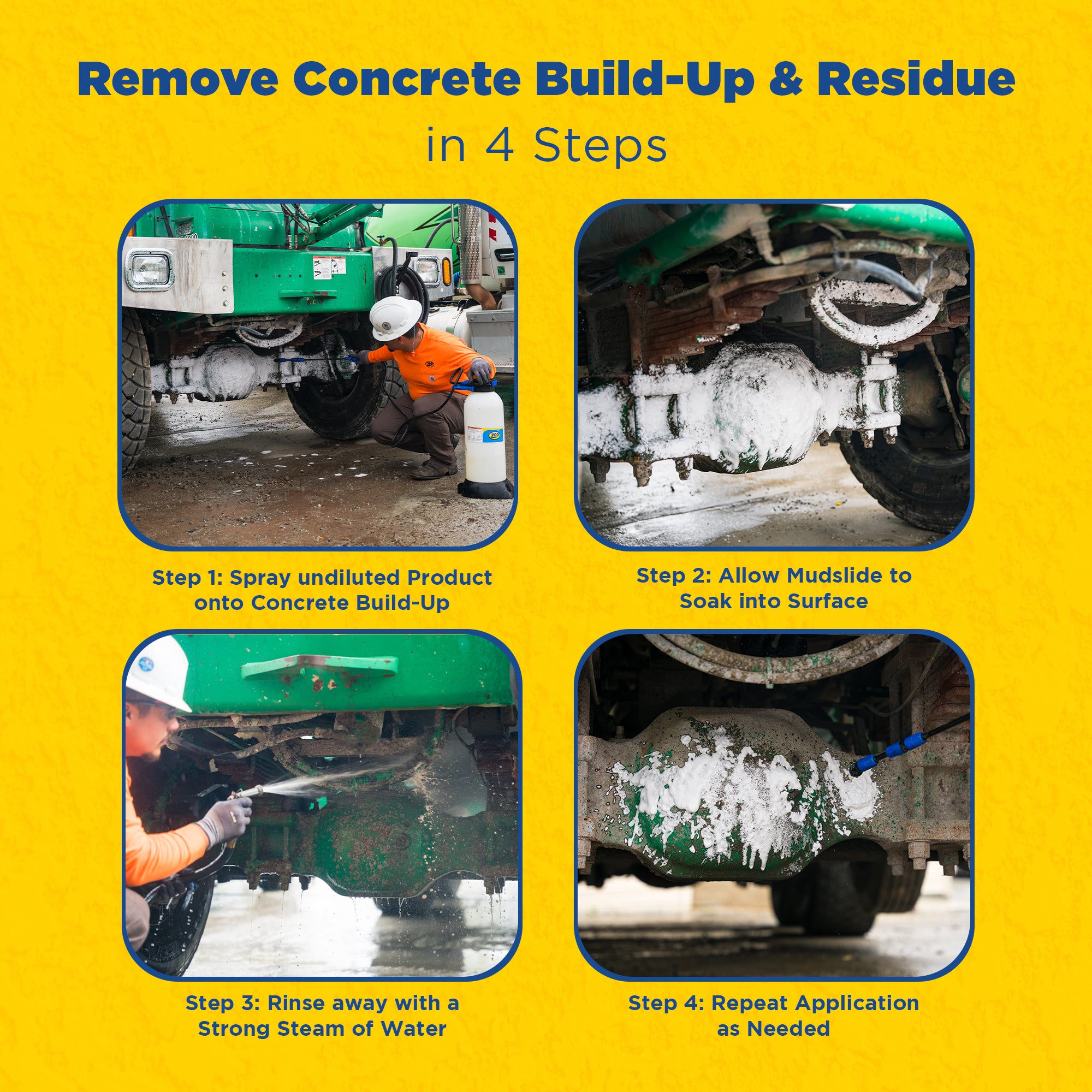 Zep Mudslide removes concrete build-up and residues from Ready-Mix trucks. forms. molds. tools. and equipment without the use of corrosive and irritating mineral acids. The organic acids work overtime to penetrate. degrade. and dissolve concrete build-up and residues. allowing them to be rinsed away. This product continues to work long after application. allowing easier removal the next day. Multiple applications may be needed when treating older. cured concrete residues. Zep Mudslide will not corrode metal surfaces or damage painted surfaces like typical concrete removers containing organic or mineral acids.