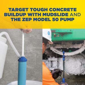 Zep Mudslide Concrete Dissolving Cleaner with Zep Model 50 Pump offers a safe and effective solution for removing concrete build-up from vehicles. tools. and job site equipment. The acid-free formula contains no hydrochloric. phosphoric. or sulfuric acids. making it safer for use on metal surfaces. Zep Mudslide uses biodegradable surfactants to soften and dissolve cured concrete while helping support responsible use in field operations. This bundle includes the Zep Model 50 Pump. which fits securely onto 5-gallon and 7-gallon pails and delivers 8 ounces per pump. allowing fast and efficient dispensing at the job site.