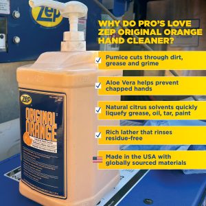 Zep Original Orange Industrial Hand Cleaner is a powerful. citrus-scented solution specially formulated to handle the toughest grime while remaining gentle on hands. This versatile orange hand cleaner effectively removes grease. dirt. and oil. Enriched with Aloe Vera. it helps prevent chapping and dryness. making it ideal for frequent use in industrial and workshop environments.