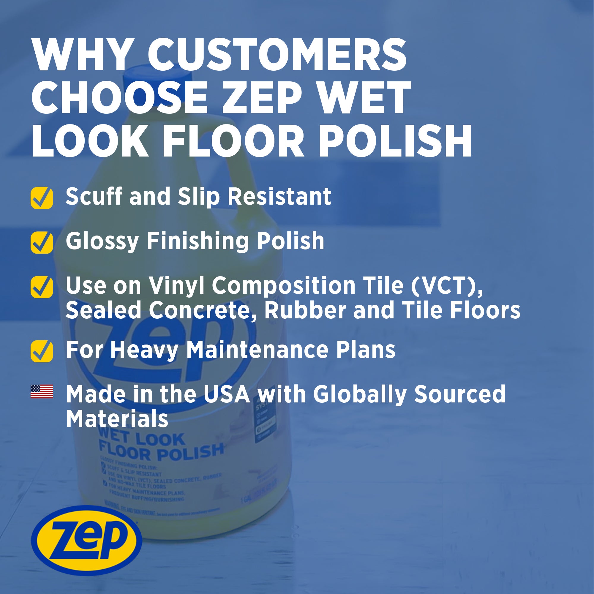 Zep Wet-Look Floor Polish is a finishing polish designed to enhance the appearance of hard interior floors. This polish delivers a slip-resistant. high-gloss finish that resists scuffs and heel marks. Ideal for use on vinyl composition tile. sealed concrete. rubber. asphalt and tile floors. Great for high-traffic areas such as supermarkets. lobbies. schools. retail stores and places that are frequently buffed or burnished.
